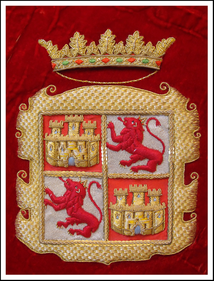 Manto de terciopelo granate bordado en oro con castillos, leones y flores de lis. Año 1920. Bordado por la camarera Elena Molina de la Muela y otras mujeres nazarenas. Donado mediante suscripción popular.