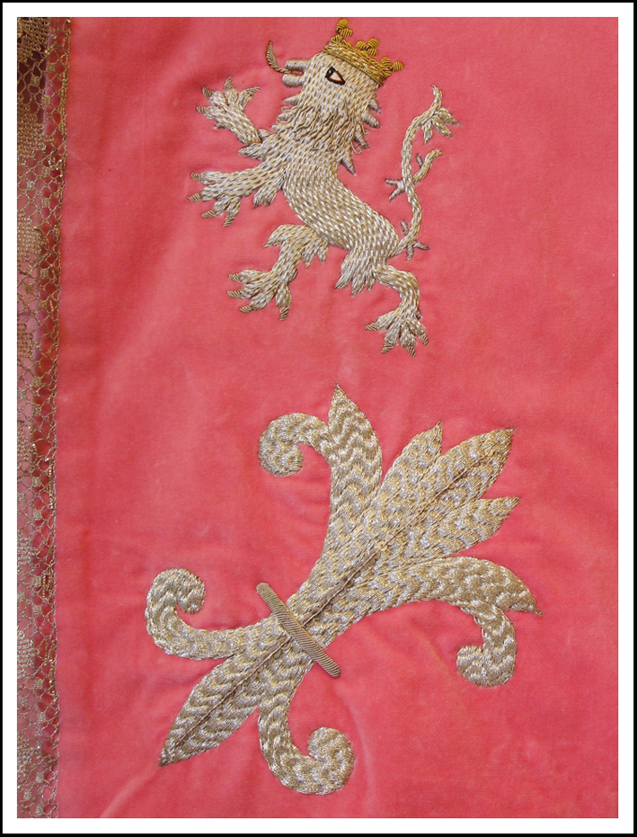Estandarte. Damasco granate bordado en oro y sedas. Realizado por la camarera Elena Molina en 1925. Restaurado y enriquecido en 1990.